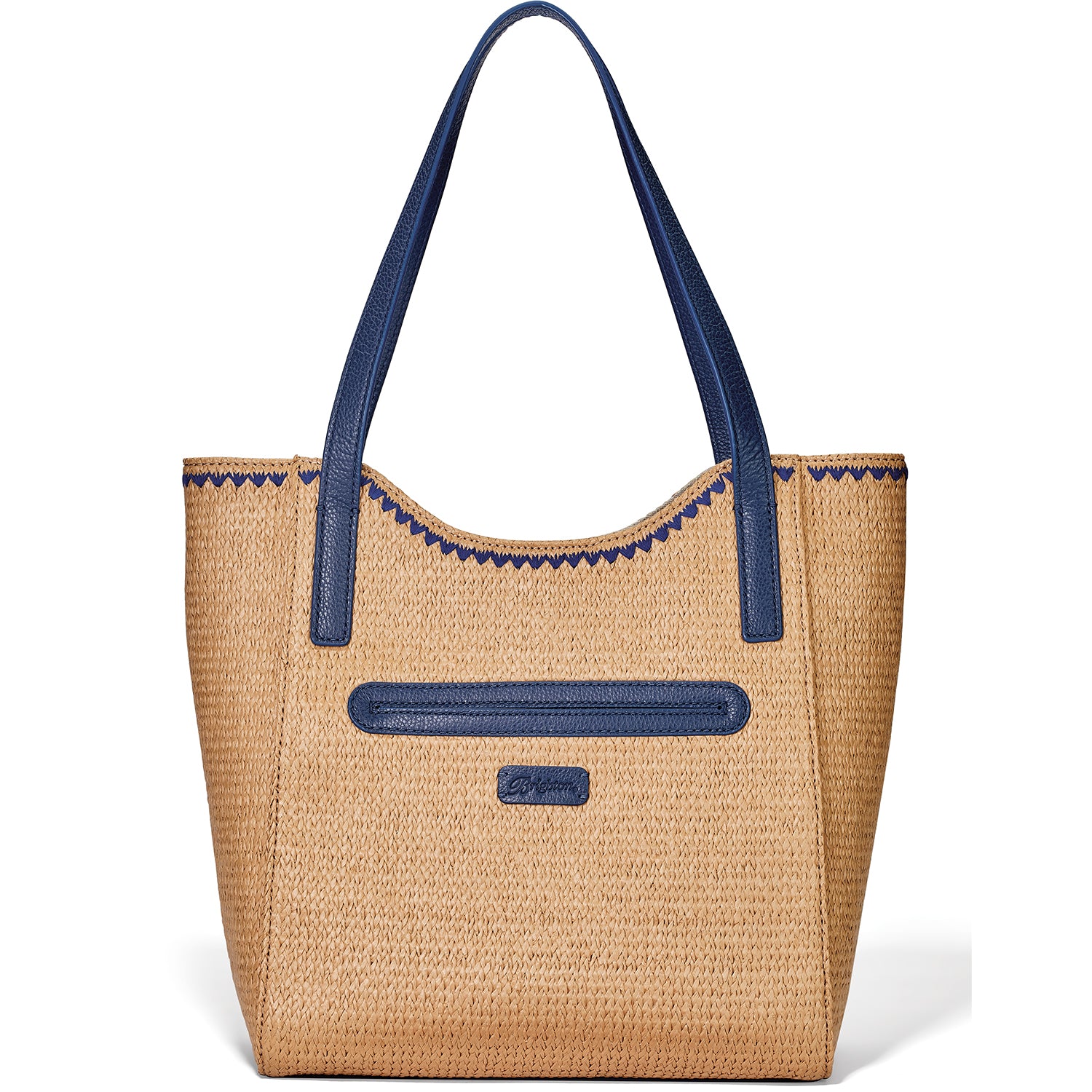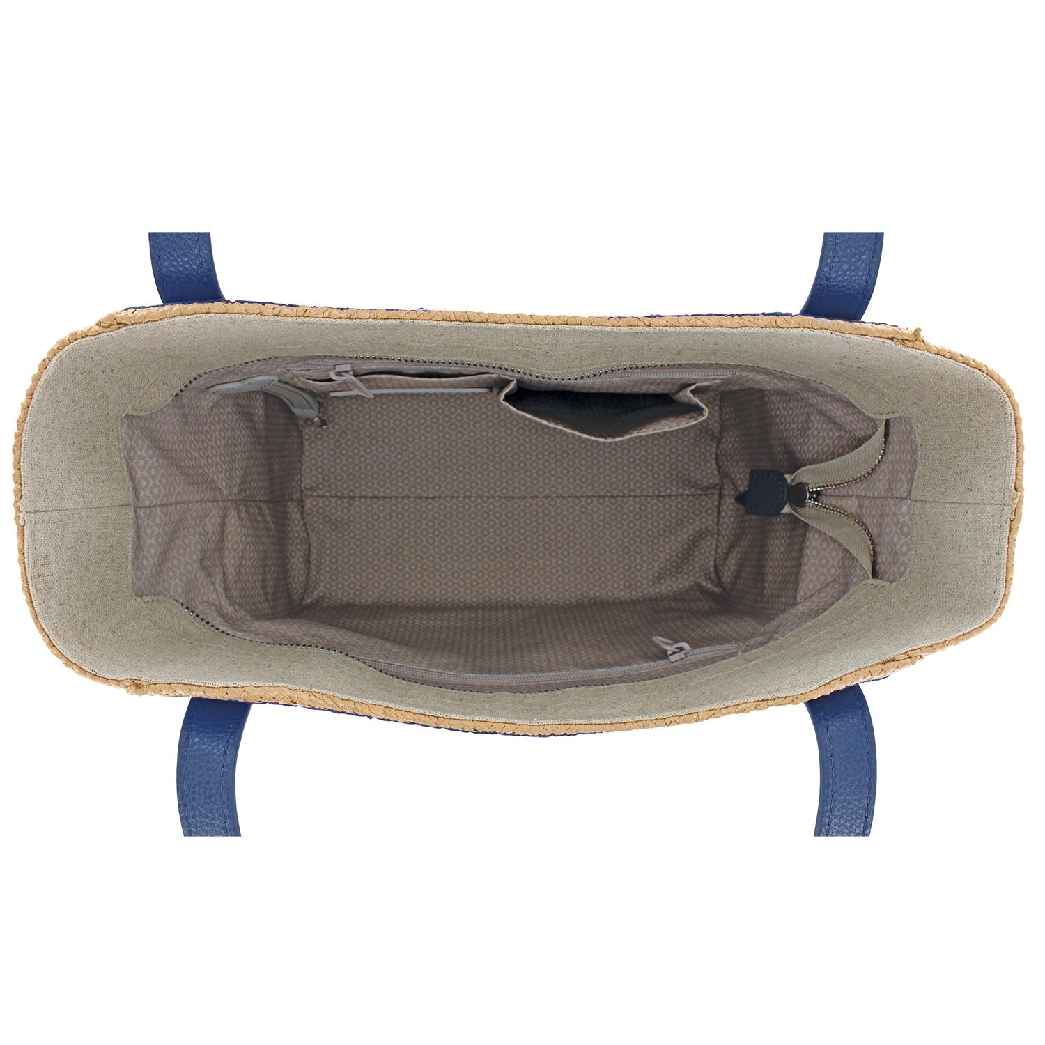 Two beautiful textures come together in this refreshing bag with a straw-like basketweave that is then embroidered with 55,000 stitches of floral artwork in a super wardrobe-friendly shade of deep blue.