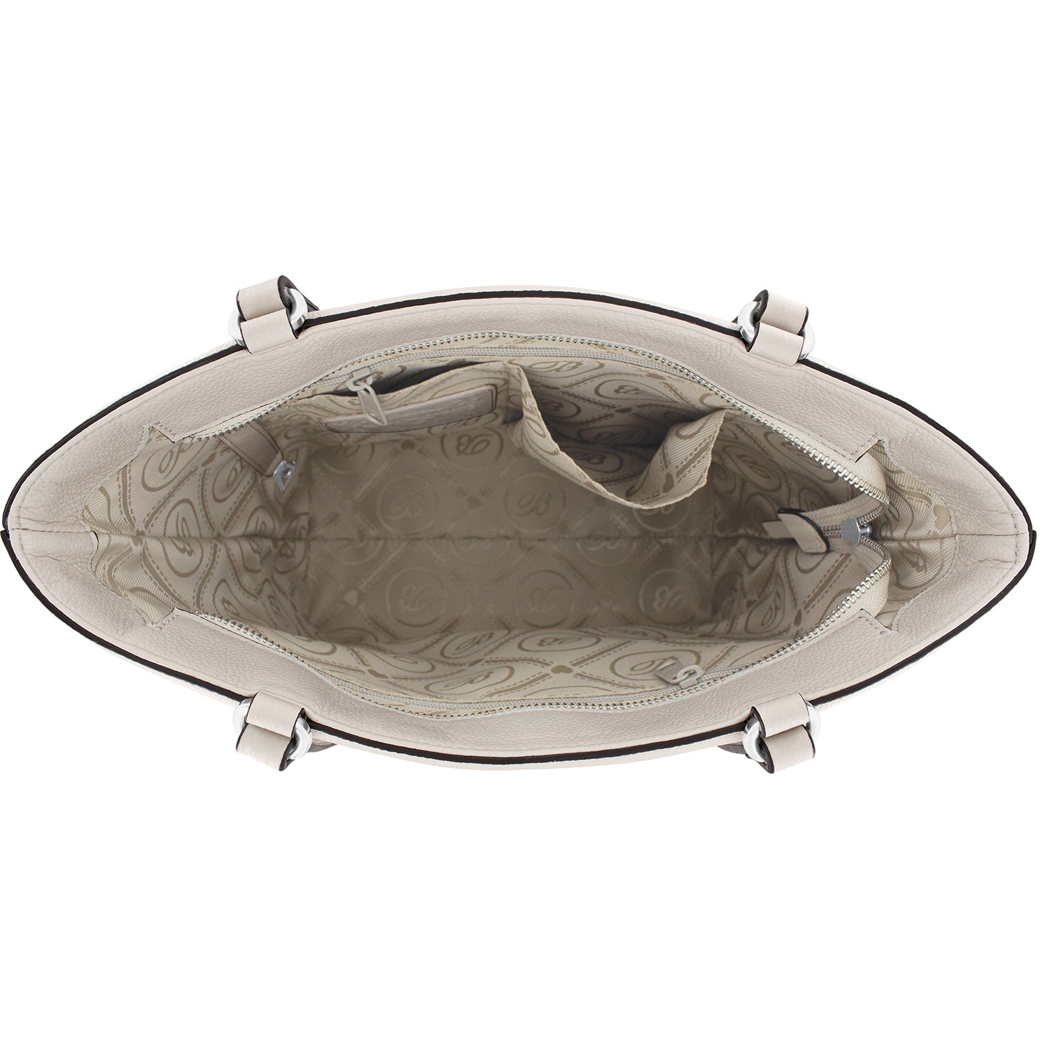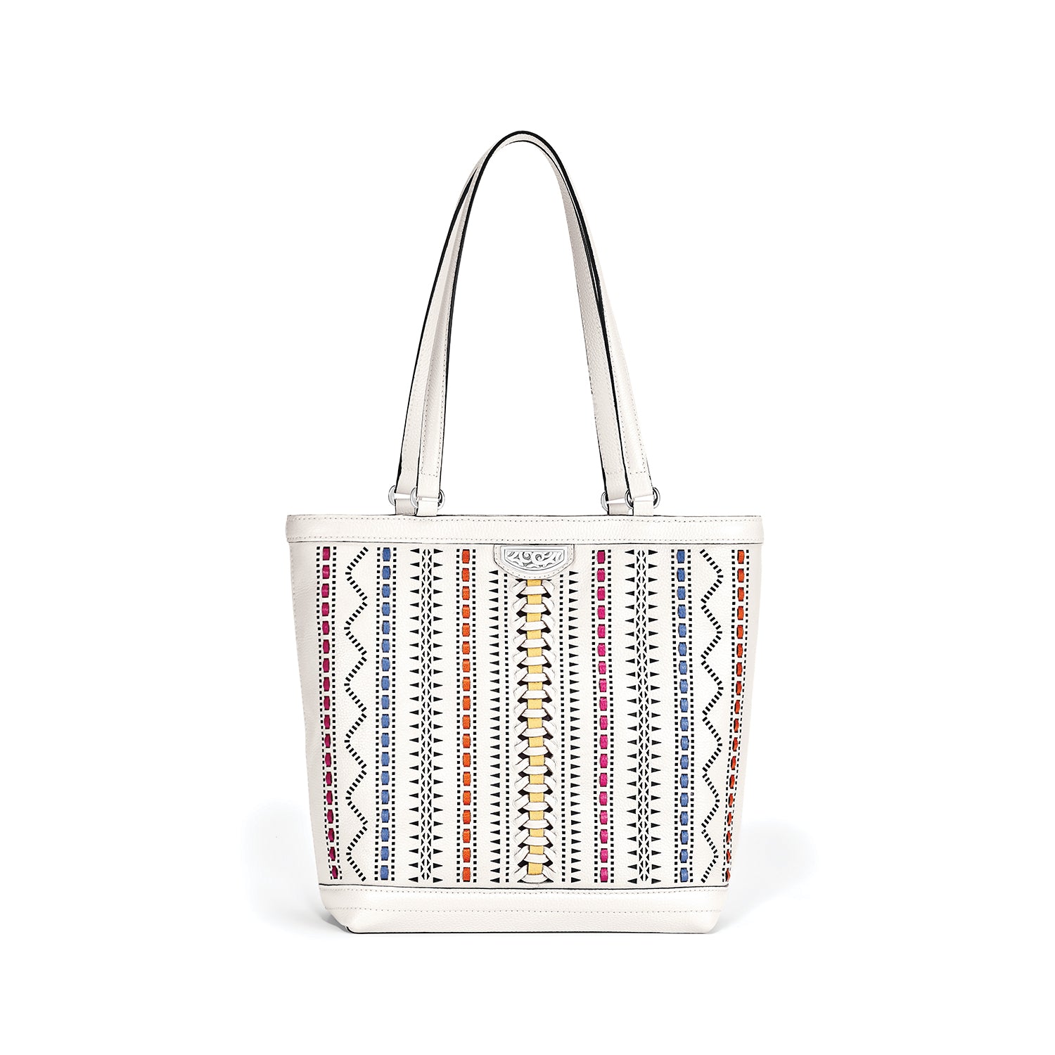 This creamy white Italian pebbled leather bag is summer-perfect, and the bags? accent colorings incorporate the new season clothing hues.